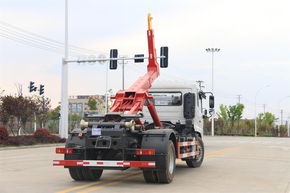 該款鉤臂式垃圾車由液壓系統、操作系統組成。舉升油制缸(1支)系國內知名液壓件廠家生產的雙作用油缸。垃圾廂可自吊上放下,可自行傾倒垃圾,上下一次工作循環時間≤50S。該車的特點是一個車能配多個垃圾廂,能實現一臺車與多個垃圾廂聯合作業,循環運輸,充分提高了車輛的運輸能力。