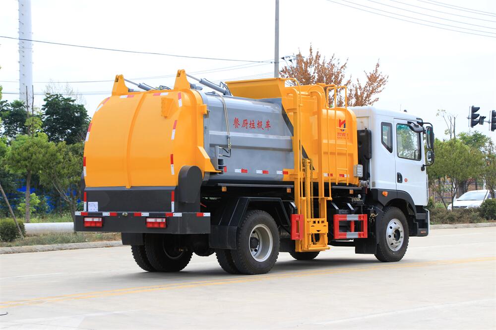 上裝配置:罐體容積10m3,配備120L/240L掛桶提升翻轉機構,液壓系統,后蓋液壓鎖緊開啟,罐體可以舉升自卸,尾部帶自流閥;用于運輸液態垃圾,其特點操作簡單,密封性好,無泄漏,無異味;可選裝固液分離功能,推板擠壓功能,常用于餐館的垃圾轉運處理。