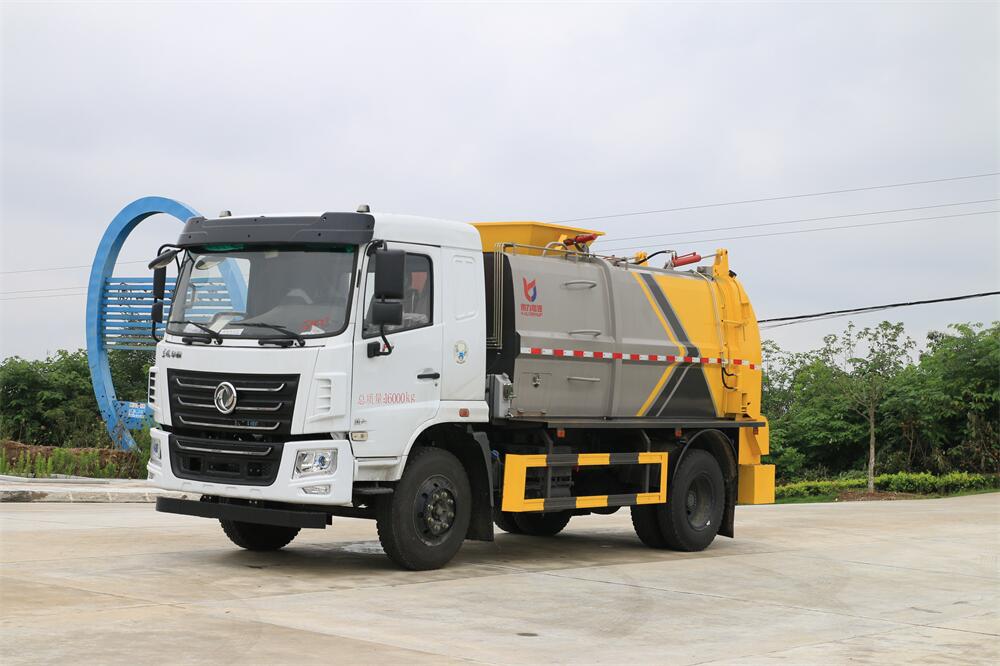 上裝配置:罐體容積10m3,配備120L/240L掛桶提升翻轉機構,液壓系統,后蓋液壓鎖緊開啟,罐體可以舉升自卸,尾部帶自流閥;用于運輸液態垃圾,其特點操作簡單,密封性好,無泄漏,無異味;可選裝固液分離功能,推板擠壓功能,常用于餐館的垃圾轉運處理。