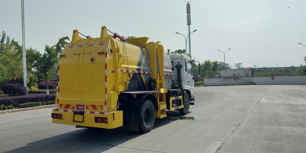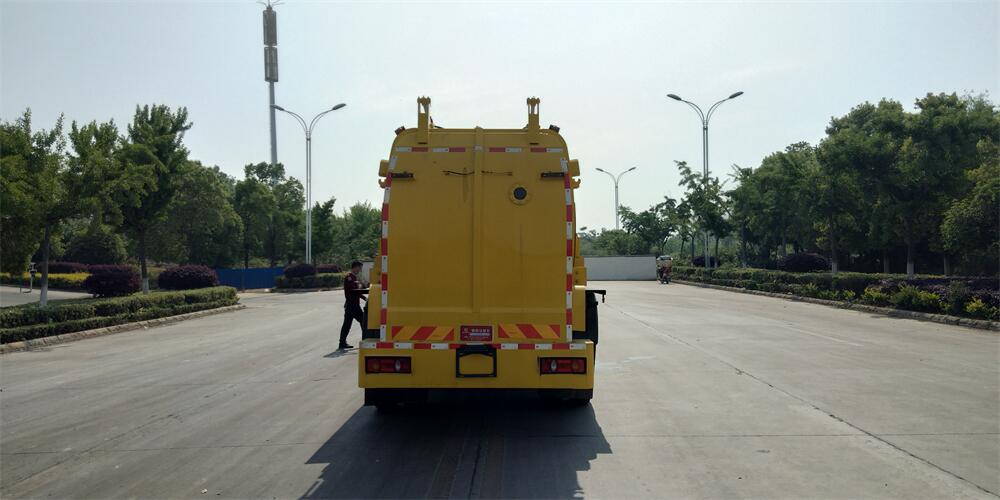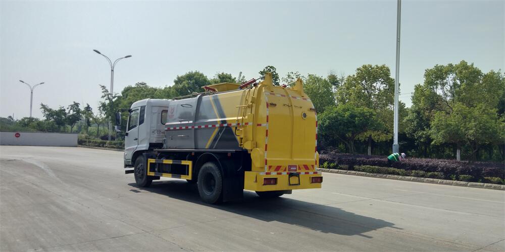 上裝配置:罐體容積12m3,配備120L/240L掛桶提升翻轉機構,液壓系統,后蓋液壓鎖緊開啟,罐體可以舉升自卸,尾部帶自流閥;用于運輸液態垃圾,其特點操作簡單,密封性好,無泄漏,無異味;可選裝固液分離功能,推板擠壓功能,常用于餐館的垃圾轉運處理。