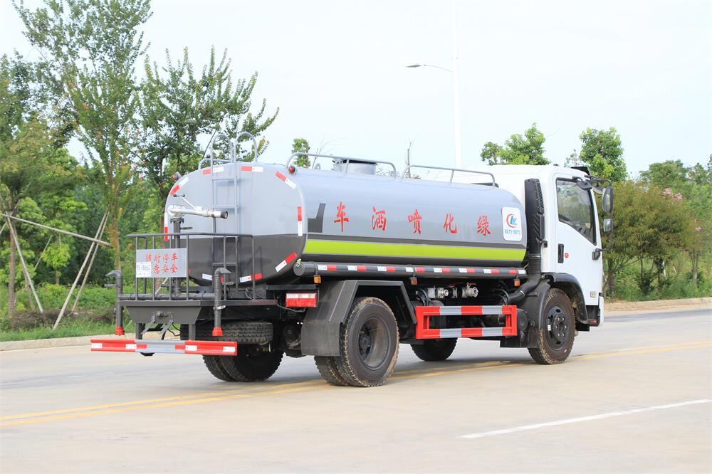 灑水車前裝有鴨形噴嘴或圓頭沖嘴,后面裝有圓柱開灑水噴嘴或蓮蓬頭噴嘴,后部有一工作平臺,裝配有水炮。后部還可裝8個噴嘴(選裝)。