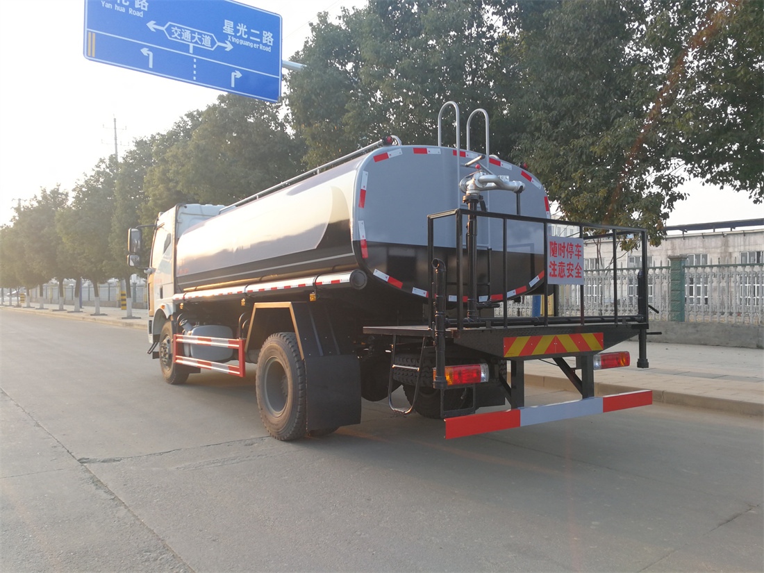 灑水車前裝有鴨形噴嘴或圓頭沖嘴,后面裝有圓柱開灑水噴嘴或蓮蓬頭噴嘴,后部有一工作平臺,裝配有水炮。后部還可裝8個噴嘴(選裝)。