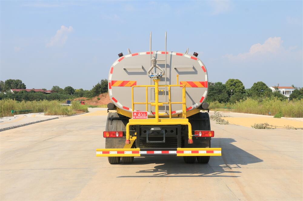 灑水車前裝有鴨形噴嘴或圓頭沖嘴,后面裝有圓柱開(kāi)灑水噴嘴或蓮蓬頭噴嘴,后部有一工作平臺(tái),裝配有水炮。后部還可裝8個(gè)噴嘴(選裝)。