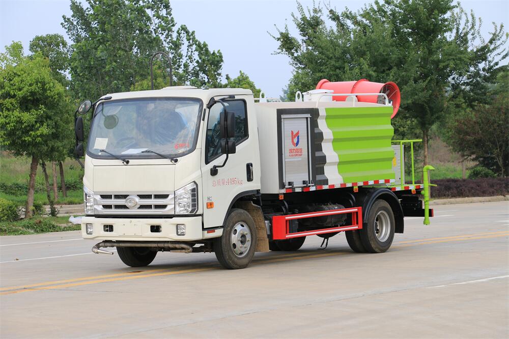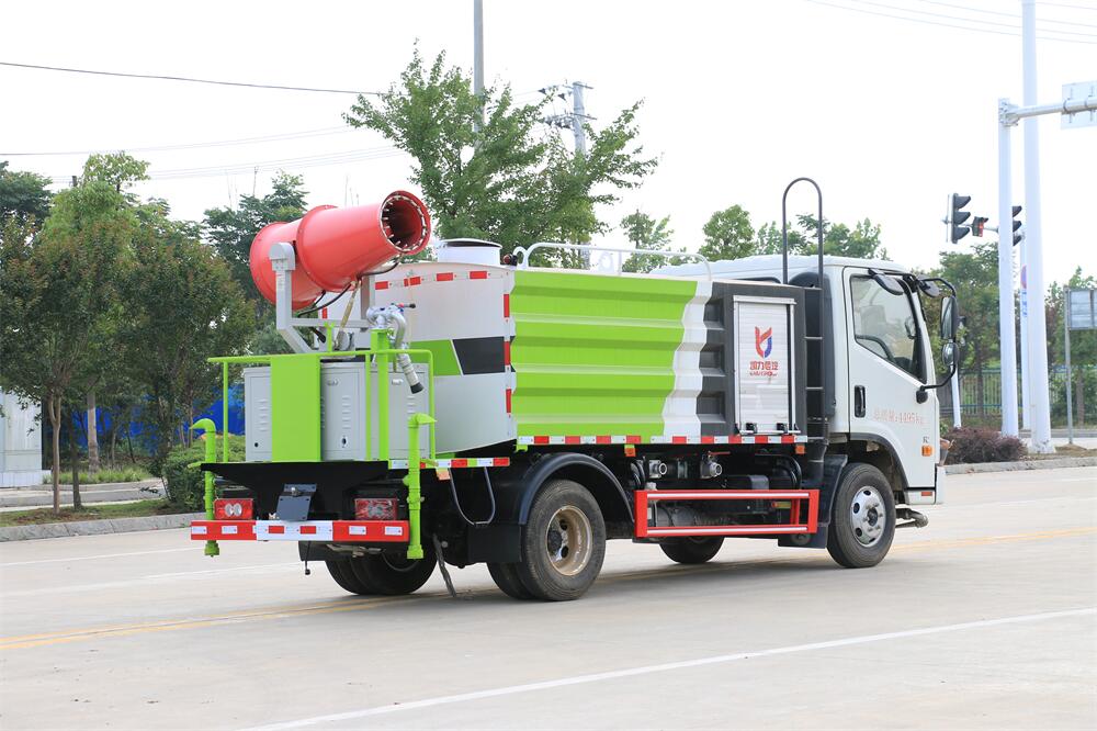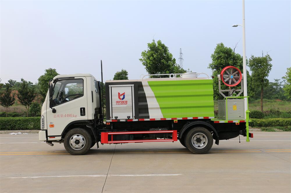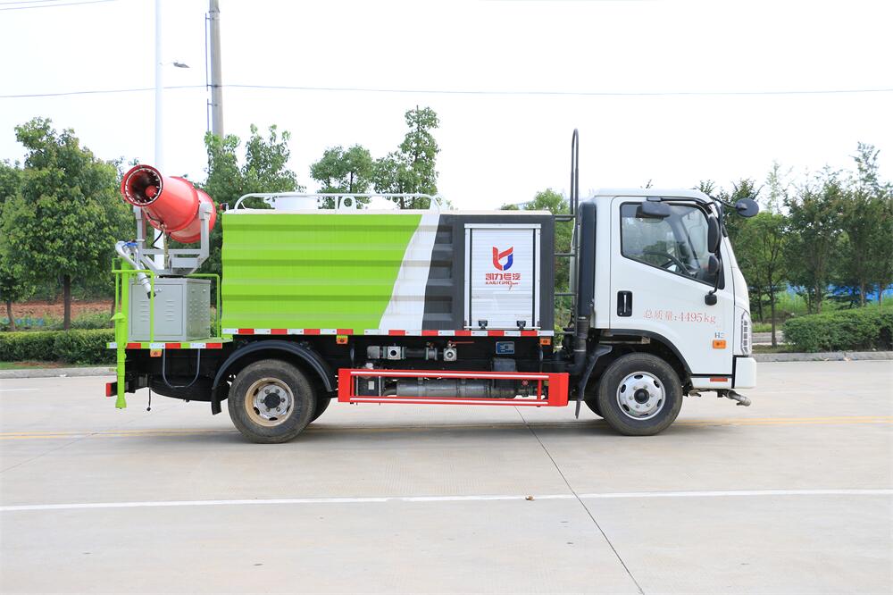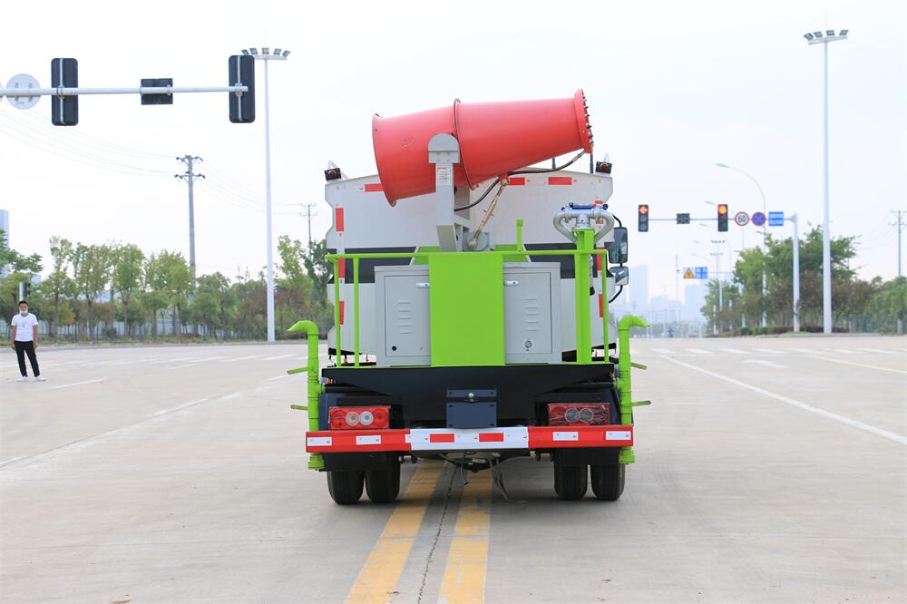 上裝配置:罐體容積為 5立方,選配風(fēng)送式霧炮機組射程30米、40米、50米、60米、80米、100米、120米霧炮,罐體鋼板為4mm碳鋼Q235材質(zhì),罐內(nèi)隔板具有防波作用,以減輕汽車行駛時罐體液體沖擊,罐體及整車外形尺寸按照公告。帶大功率專用灑水泵,泵可自吸自排,整車前沖、后灑、側(cè)噴、帶65消防接口,后平臺配CLW-50、CLW-60、CLW-80、CLW-100、CLW-120型風(fēng)送式霧炮機組;罐體前封頭配大功率柴油發(fā)電機組;前封頭帶水位計,后平臺主管路帶1寸澆花接口,后爬梯。帶兩根輸水管及陰陽端。罐體顏色:銀/灰/綠,罐體兩側(cè)噴“多功能抑塵車”字樣,貼反光標(biāo)示。