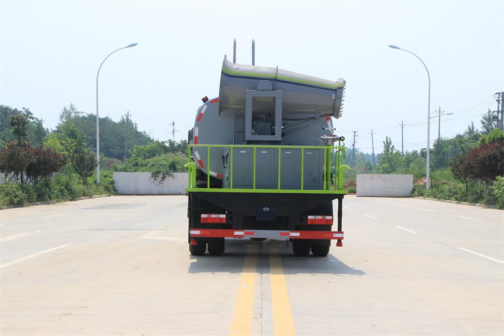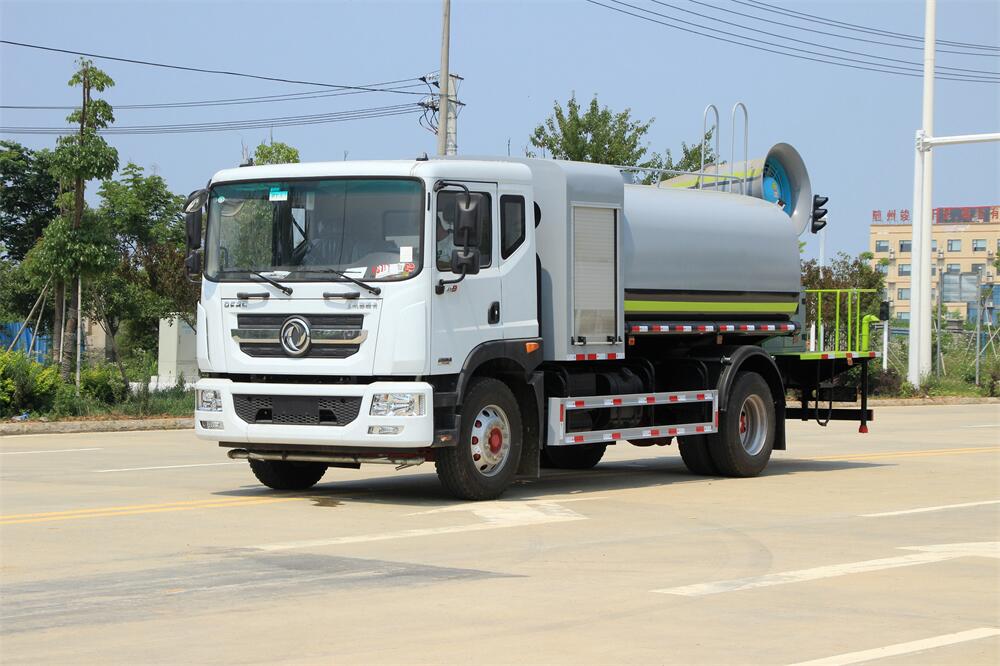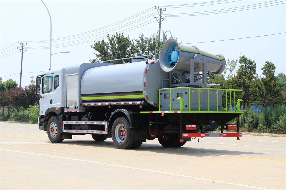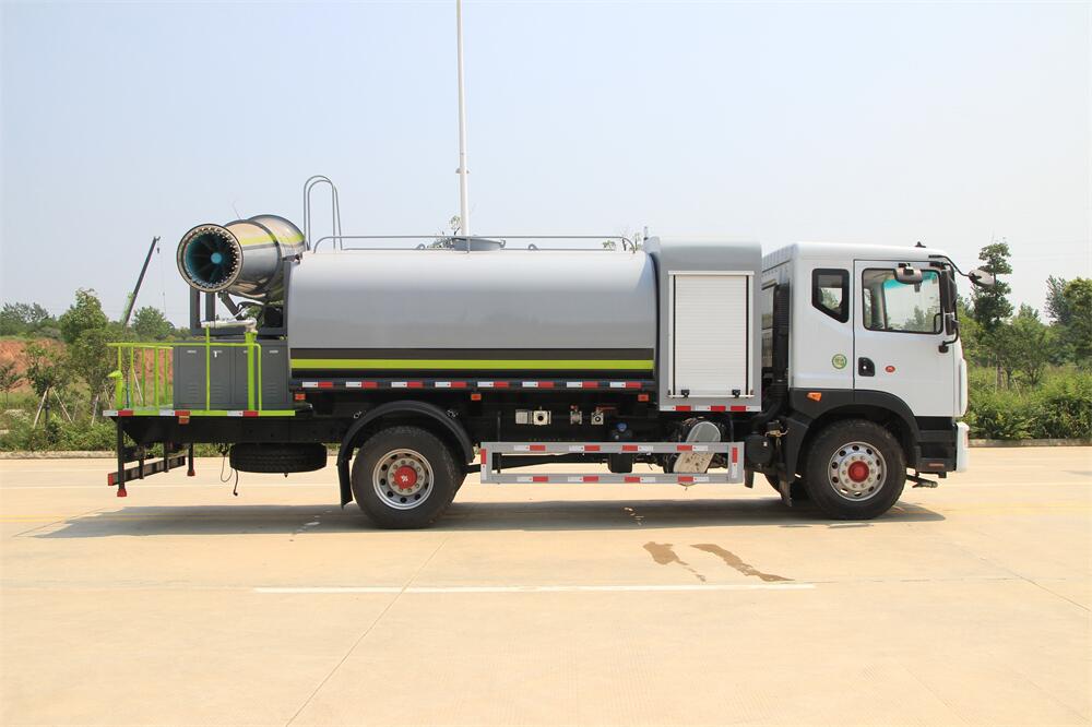 上裝配置:罐體容積為 12立方,選配風送式霧炮機組射程30米、40米、50米、60米、80米、100米、120米霧炮,罐體鋼板為4mm碳鋼Q235材質(zhì),罐內(nèi)隔板具有防波作用,以減輕汽車行駛時罐體液體沖擊,罐體及整車外形尺寸按照公告。帶大功率專用灑水泵,泵可自吸自排,整車前沖、后灑、側(cè)噴、帶65消防接口,后平臺配CLW-50、CLW-60、CLW-80、CLW-100、CLW-120型風送式霧炮機組;罐體前封頭配大功率柴油發(fā)電機組;前封頭帶水位計,后平臺主管路帶1寸澆花接口,后爬梯。帶兩根輸水管及陰陽端。罐體顏色:銀/灰/綠,罐體兩側(cè)噴“多功能抑塵車”字樣,貼反光標示。