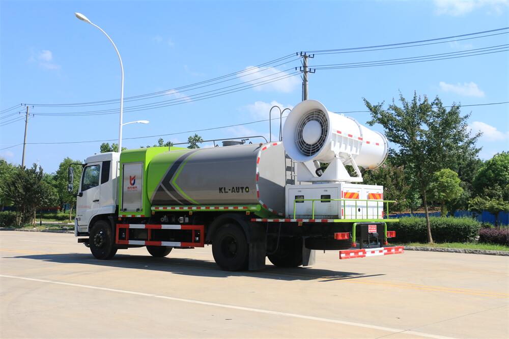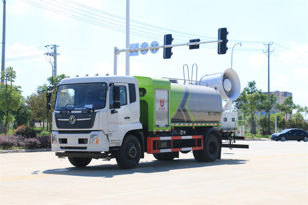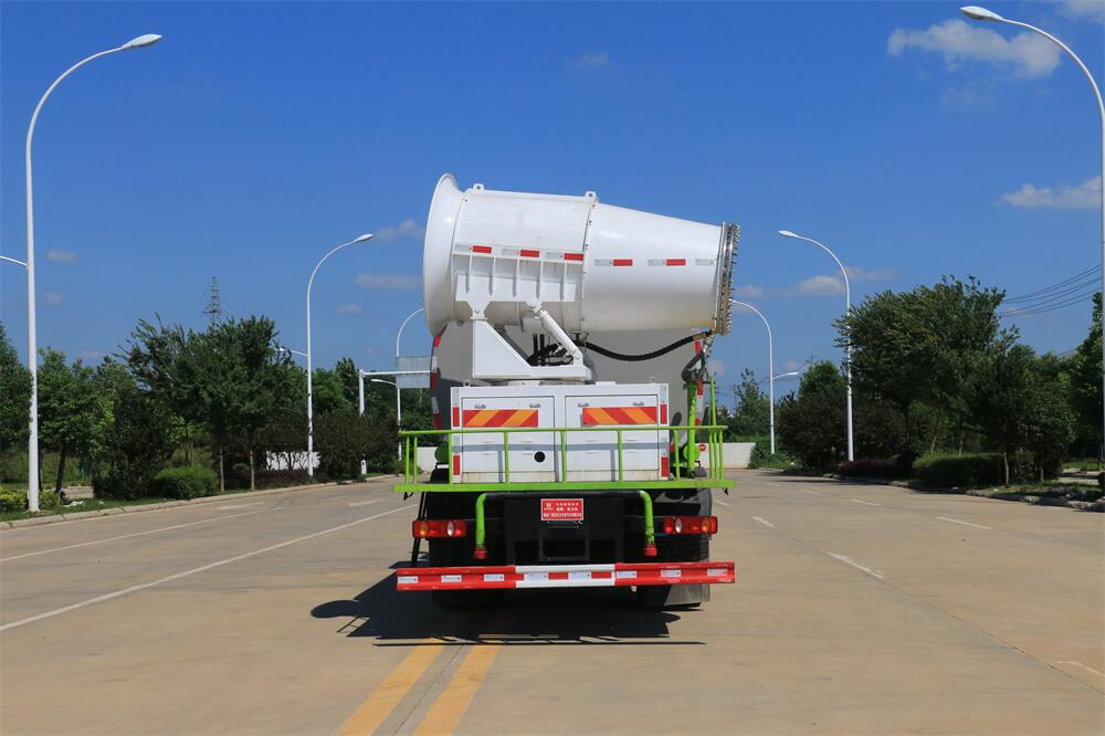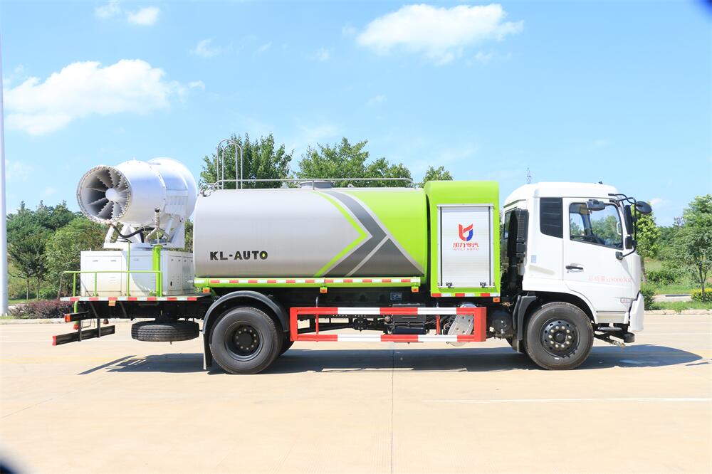 上裝配置:罐體容積為 12立方,選配風送式霧炮機組射程30米、40米、50米、60米、80米、100米、120米霧炮,罐體鋼板為4mm碳鋼Q235材質(zhì),罐內(nèi)隔板具有防波作用,以減輕汽車行駛時罐體液體沖擊,罐體及整車外形尺寸按照公告。帶大功率專用灑水泵,泵可自吸自排,整車前沖、后灑、側噴、帶65消防接口,后平臺配CLW-50、CLW-60、CLW-80、CLW-100、CLW-120型風送式霧炮機組;罐體前封頭配大功率柴油發(fā)電機組;前封頭帶水位計,后平臺主管路帶1寸澆花接口,后爬梯。帶兩根輸水管及陰陽端。罐體顏色:銀/灰/綠,罐體兩側噴“多功能抑塵車”字樣,貼反光標示。
