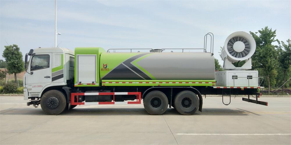 上裝配置:罐體容積為 16立方,選配風(fēng)送式霧炮機組射程30米、40米、50米、60米、80米、100米、120米霧炮,罐體鋼板為4mm碳鋼Q235材質(zhì),罐內(nèi)隔板具有防波作用,以減輕汽車行駛時罐體液體沖擊,罐體及整車外形尺寸按照公告。帶大功率專用灑水泵,泵可自吸自排,整車前沖、后灑、側(cè)噴、帶65消防接口,后平臺配CLW-50、CLW-60、CLW-80、CLW-100、CLW-120型風(fēng)送式霧炮機組;罐體前封頭配大功率柴油發(fā)電機組;前封頭帶水位計,后平臺主管路帶1寸澆花接口,后爬梯。帶兩根輸水管及陰陽端。罐體顏色:銀/灰/綠,罐體兩側(cè)噴“多功能抑塵車”字樣,貼反光標示。