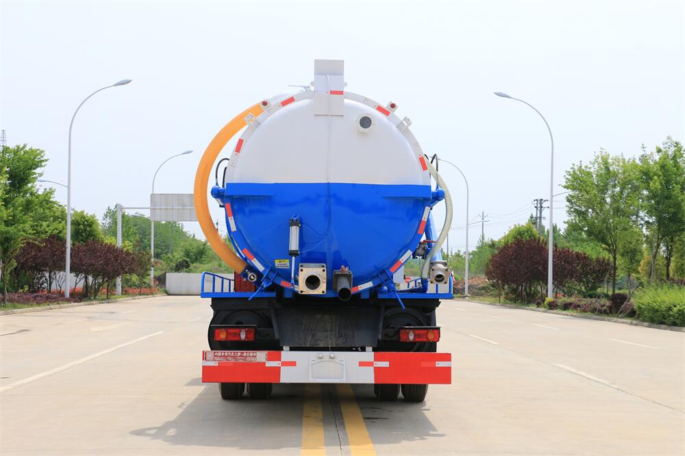上裝配置:清水罐約 5 立方,污水罐約 10 立 方;罐體 8mm 厚,封頭 8mm 厚,水罐、污罐可 互通,用 100 球閥**開關;清洗部份采用天 津通潔高壓泵,壓力 19Mpa,流量 215L/min, 配 80 米直徑 22 高壓管帶液壓卷盤;吸污部份 采用濰柴375馬力副發動機帶山東SK-30水循 環泵(副發自帶),吸污罐帶舉升,后封頭焊 死(可選擇后封頭全開),尾部加裝一個 600mm 快開,罐體后尾部一個 DN150 排污口球閥,一 個 DN100 吸污球閥帶出口盤,一個視污窗,一 根 10m 吸污管,一套陰陽端,壓力表,防溢 閥,箭頭燈,工具箱,淋管裝置,高壓泵帶氣 吹水。配一個 4.5 公斤水雷噴頭,另帶一個 80 公分手持洗車噴頭。