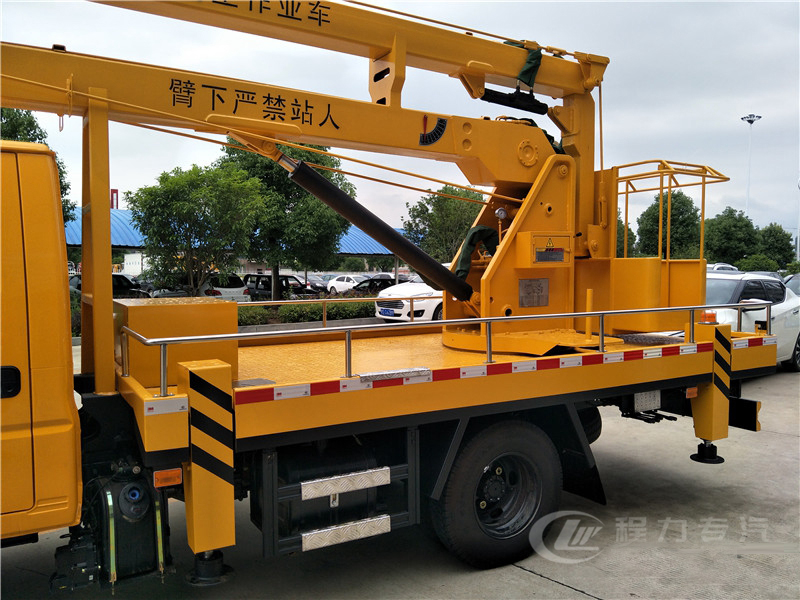其他 該車前伸為800mm。選裝二節工作臂時,作業高度為12米; 選裝三節工作臂時,作業高度為14米和16米。防護材料:Q23**碳鋼,連接方式:左右側面及后下部防護均采用焊接連接,后部防護斷面尺寸(mm):170×50,后部防護離地高度(mm):350。ABS系統型號:APG3550500A,ABS系統生產廠家:浙江亞太機電股份有限公司。該車可選裝帶電控操作箱。專用裝置:吊臂,主要用于高空作業,進行維修、安裝、清洗、攝影、造船、化工、電力、剪枝、更換路燈及其他工程搶修作業。